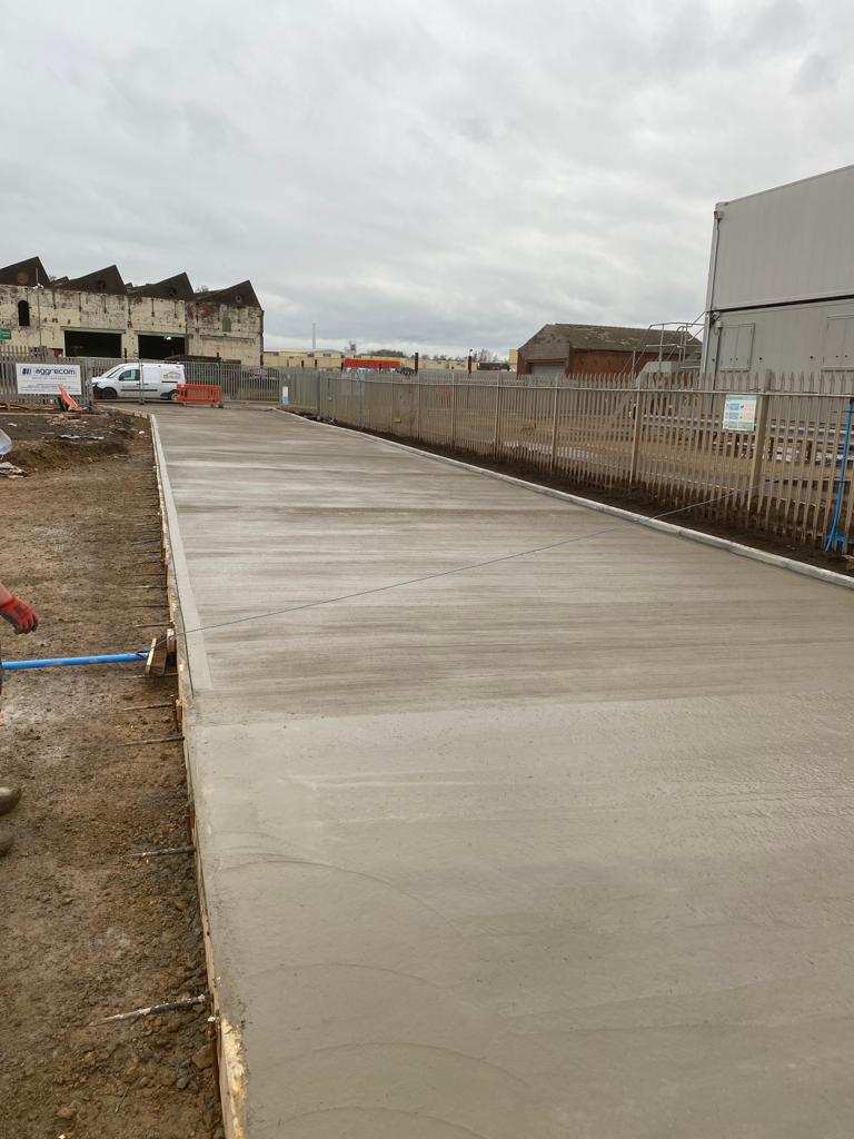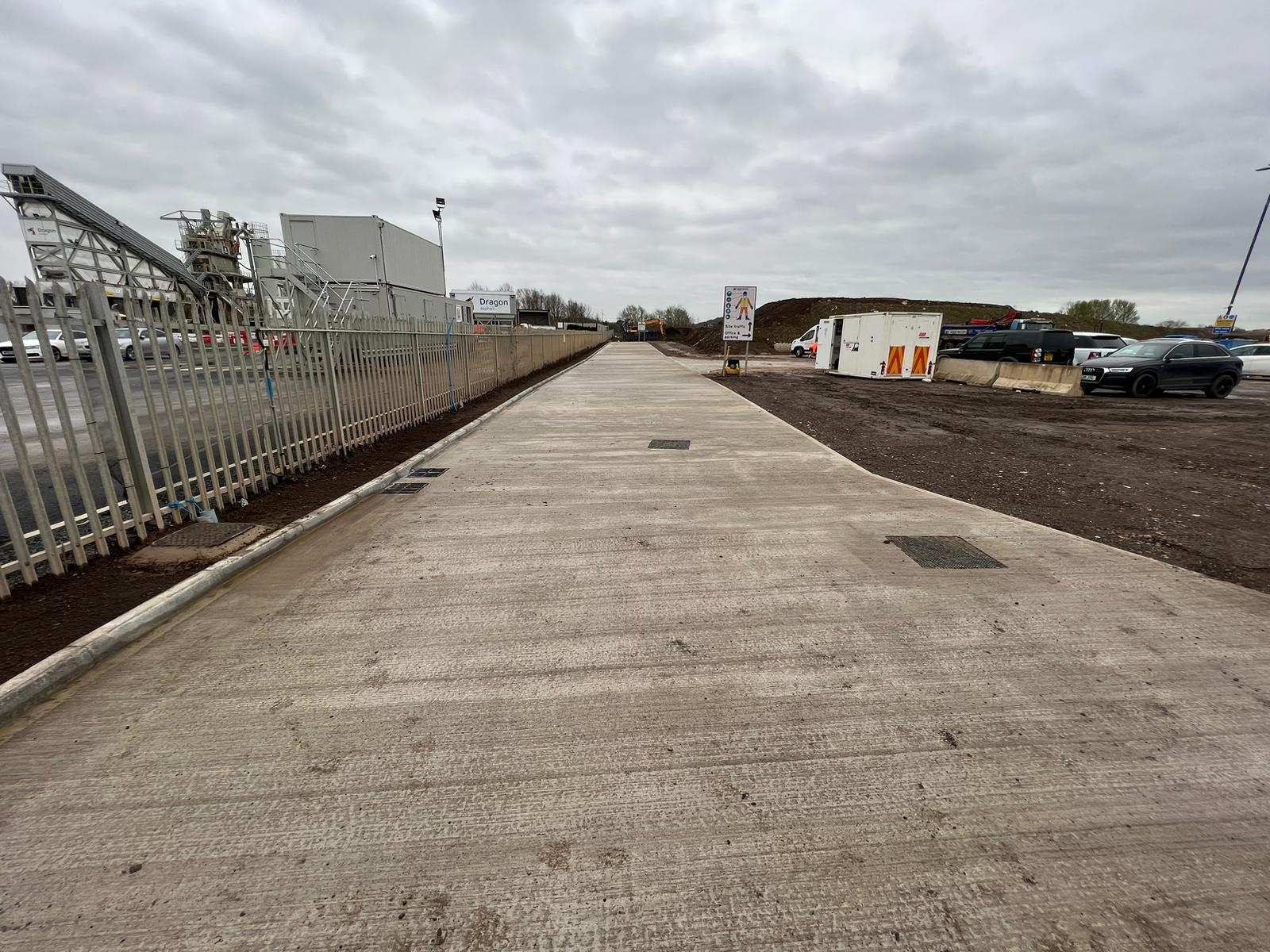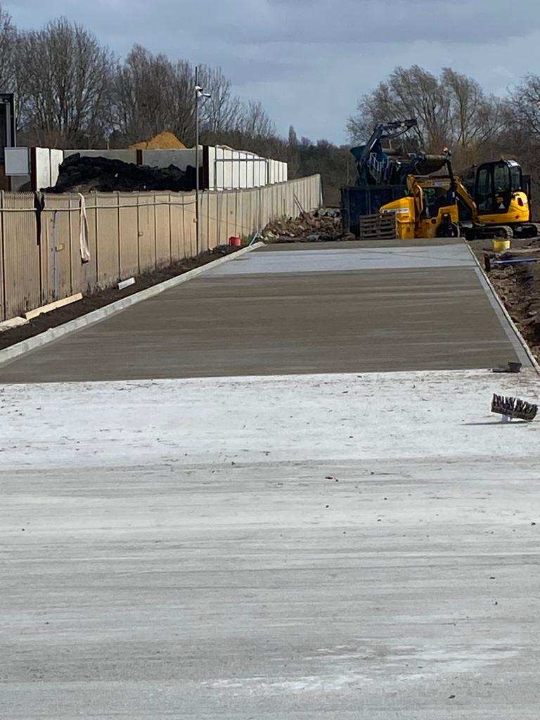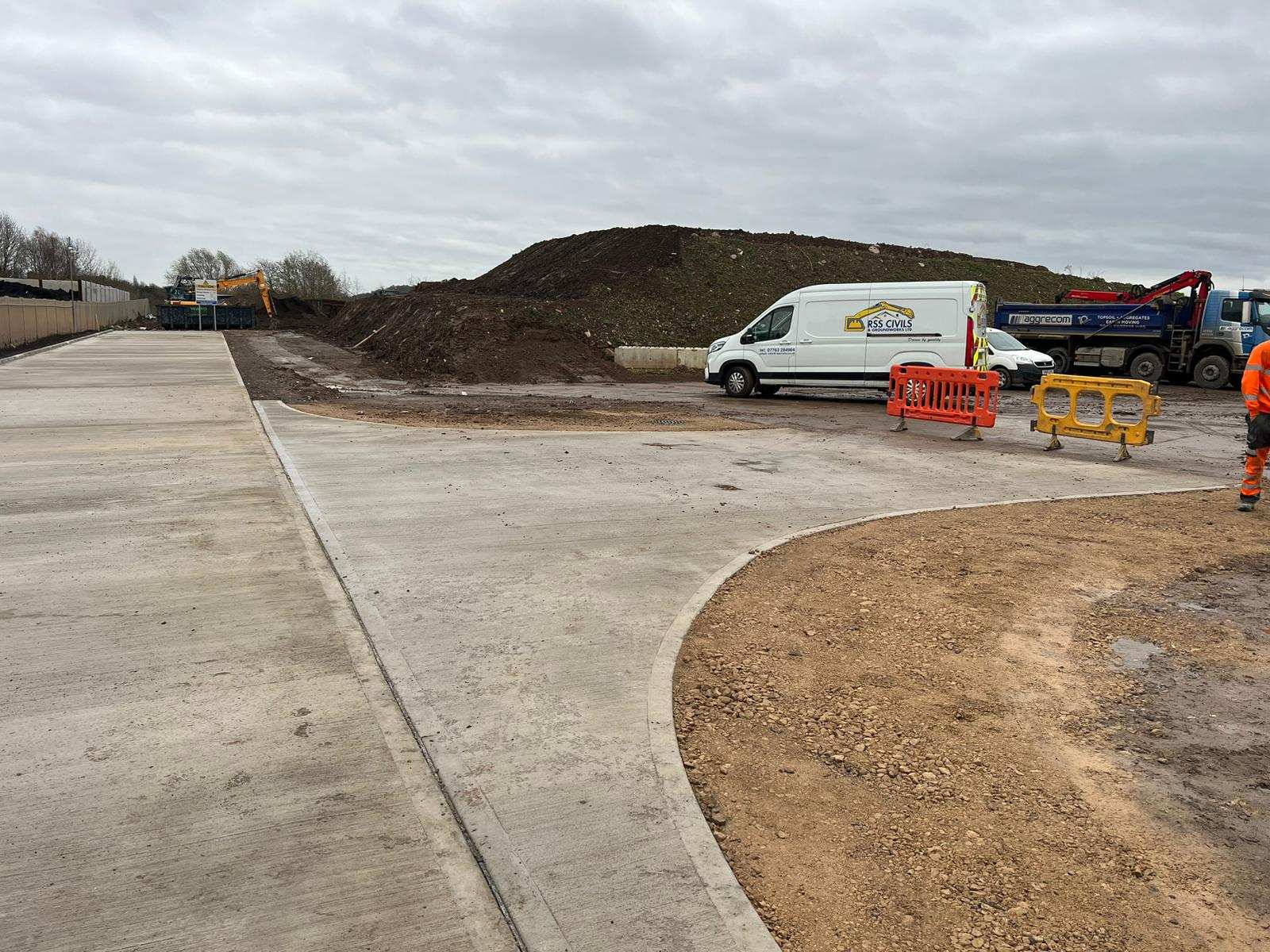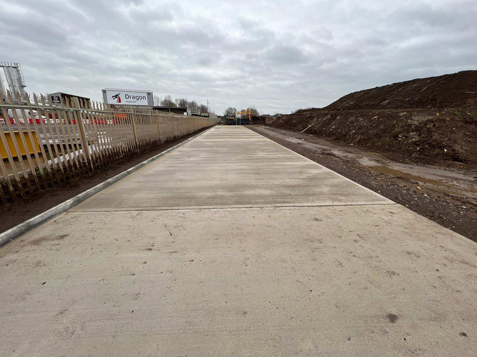In February of 2023 RSS were tasked with installing a new concrete Haul road from the entrance of Aggrecom (A local aggregate contractor) to their material storage area at the opposite end of their site. The sites existing entrance required closure for the duration of the works and access was granted through the neighbouring company’s site. Due to this measure, it was imperative that the works were carried out on the tightest possible programme. Works consisted of a reduce level dig due to the existing road being 600mm higher than the proposed, connection into the existing culvert, new surface water drainage including gullies, attenuation and flow control chambers, new kerbs and a brushed finished concrete slab.