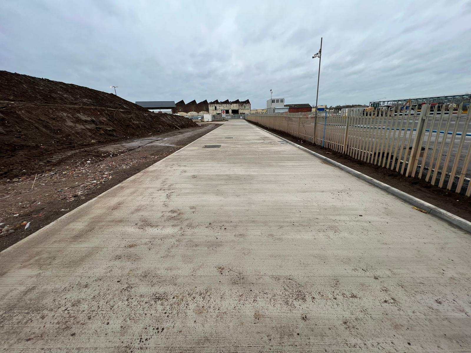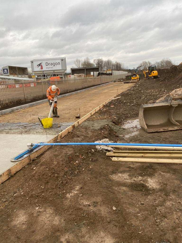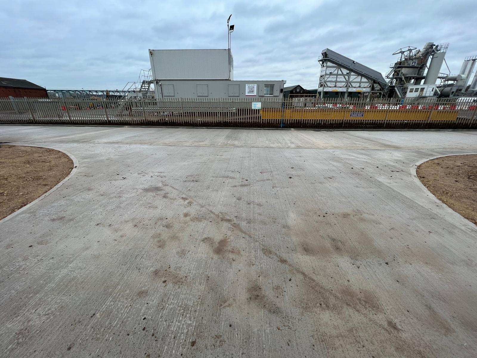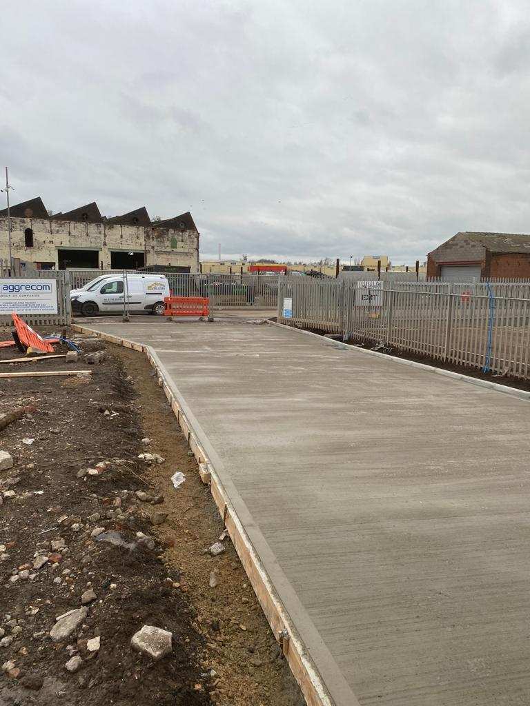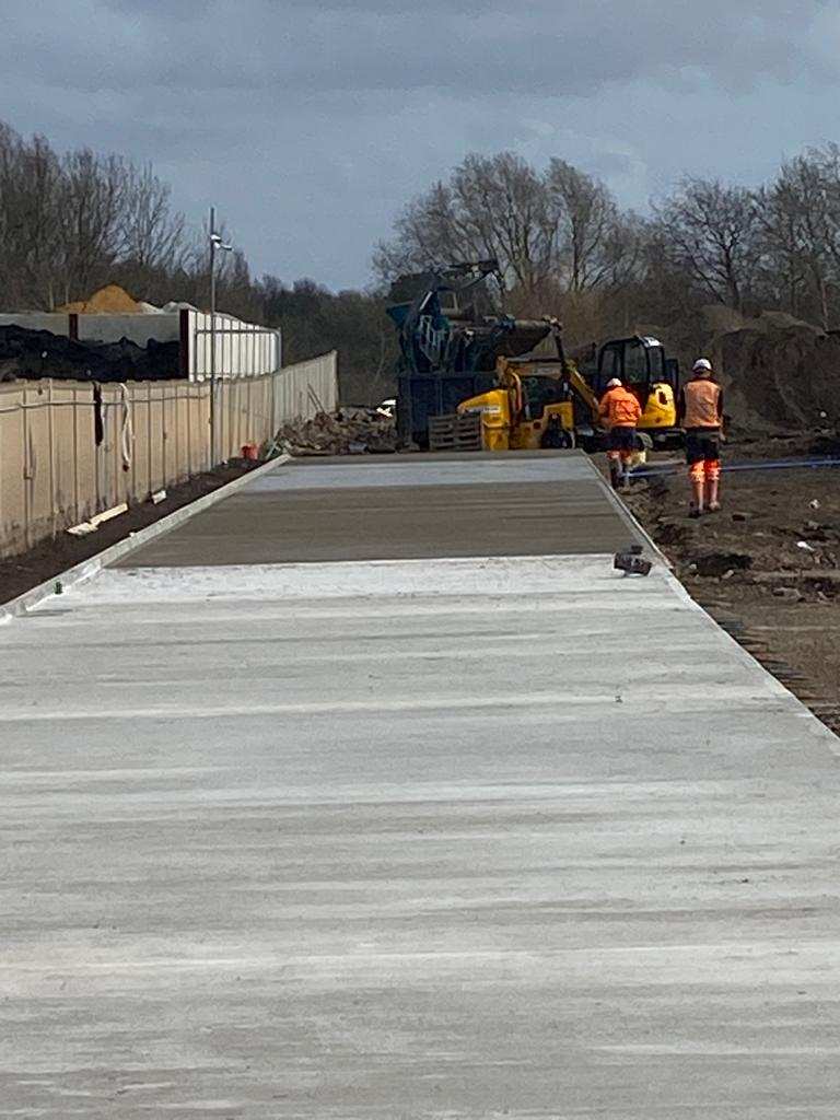In February of 2023 RSS were tasked with installing a new concrete Haul road from the entrance of Aggrecom (A local aggregate contractor) to their material storage area at the opposite end of their site. The sites existing entrance required closure for the duration of the works and access was granted through the neighbouring company’s site. Due to this measure, it was imperative that the works were carried out on the tightest possible programme. Works consisted of a reduce level dig due to the existing road being 600mm higher than the proposed, connection into the existing culvert, new surface water drainage including gullies, attenuation and flow control chambers, new kerbs and a brushed finished concrete slab.