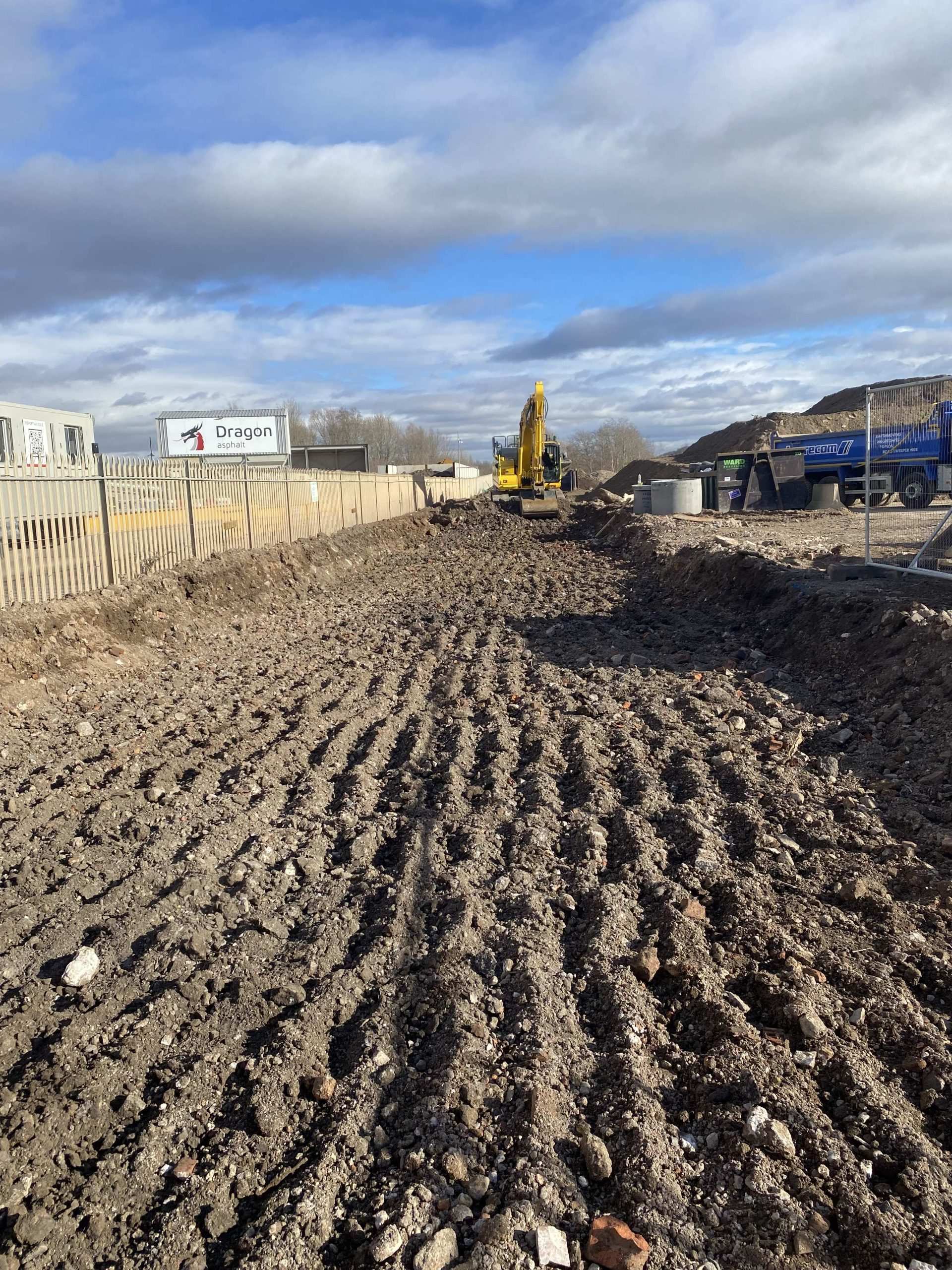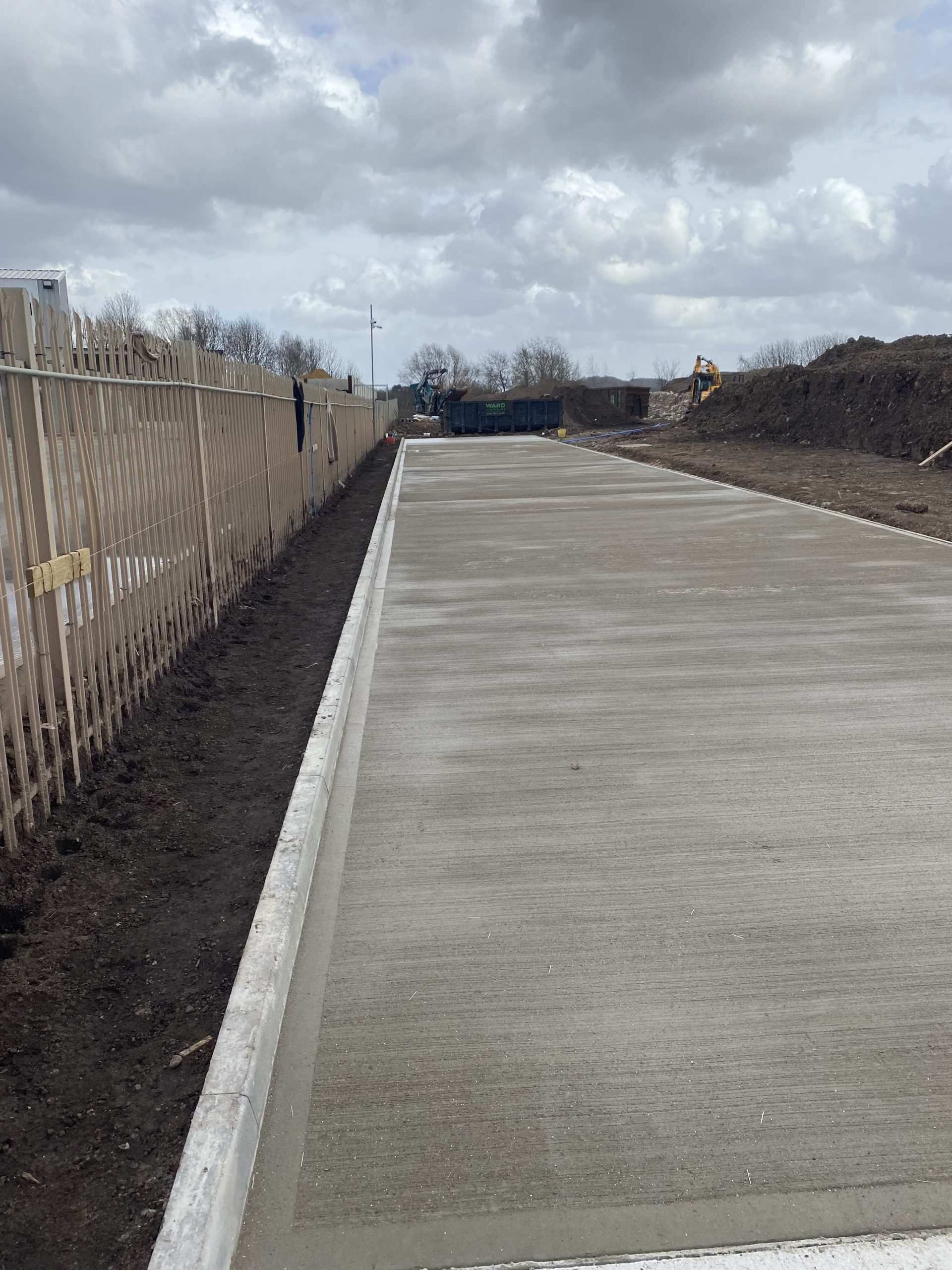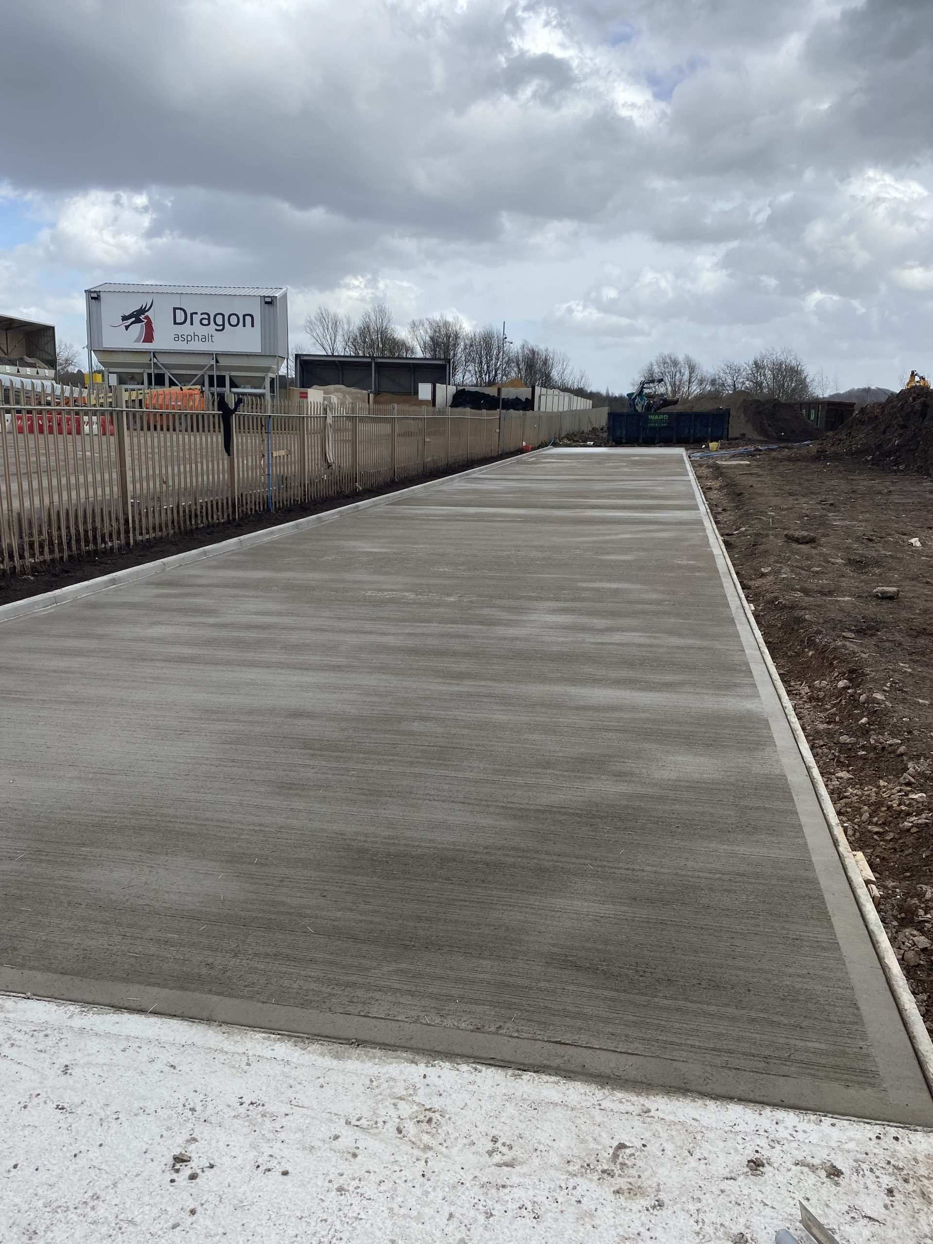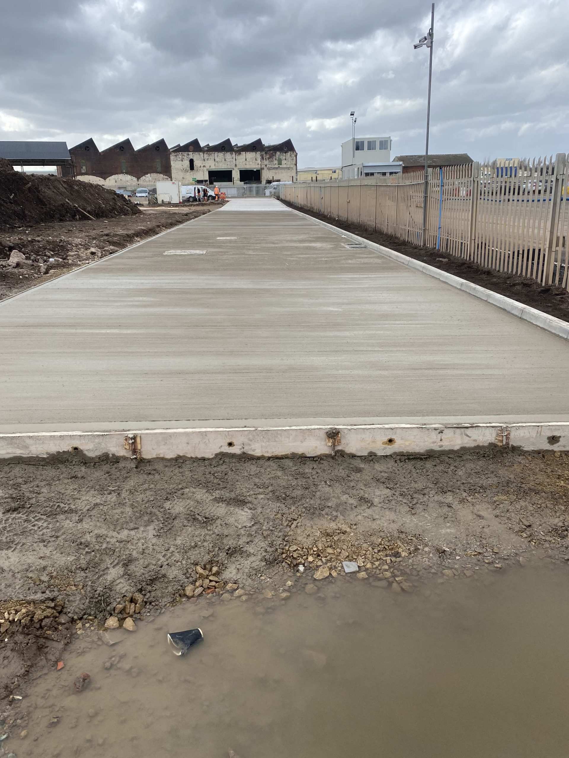 In February of 2023 RSS were tasked with installing a new concrete Haul road from the entrance of Aggrecom (A local aggregate contractor) to their material storage area at the opposite end of their site. The sites existing entrance required closure for the duration of the works and access was granted through the neighbouring company’s site. Due to this measure, it was imperative that the works were carried out on the tightest possible programme. Works consisted of a reduce level dig due to the existing road being 600mm higher than the proposed, connection into the existing culvert, new surface water drainage including gullies, attenuation and flow control chambers, new kerbs and a brushed finished concrete slab.
