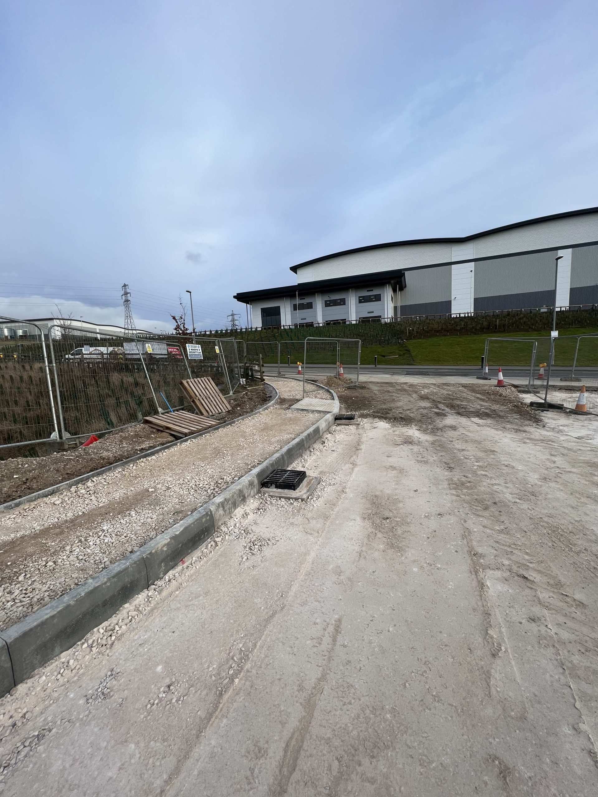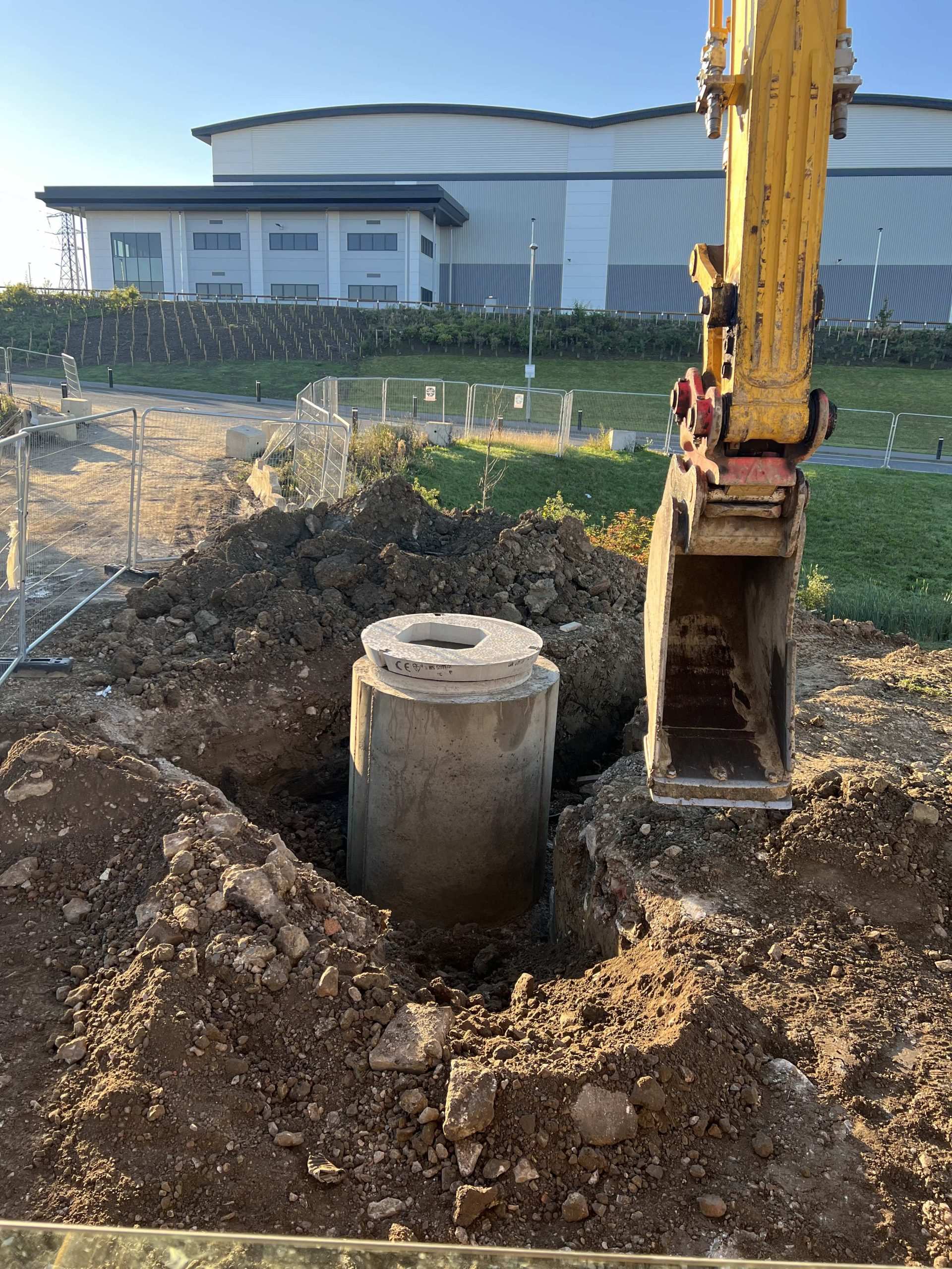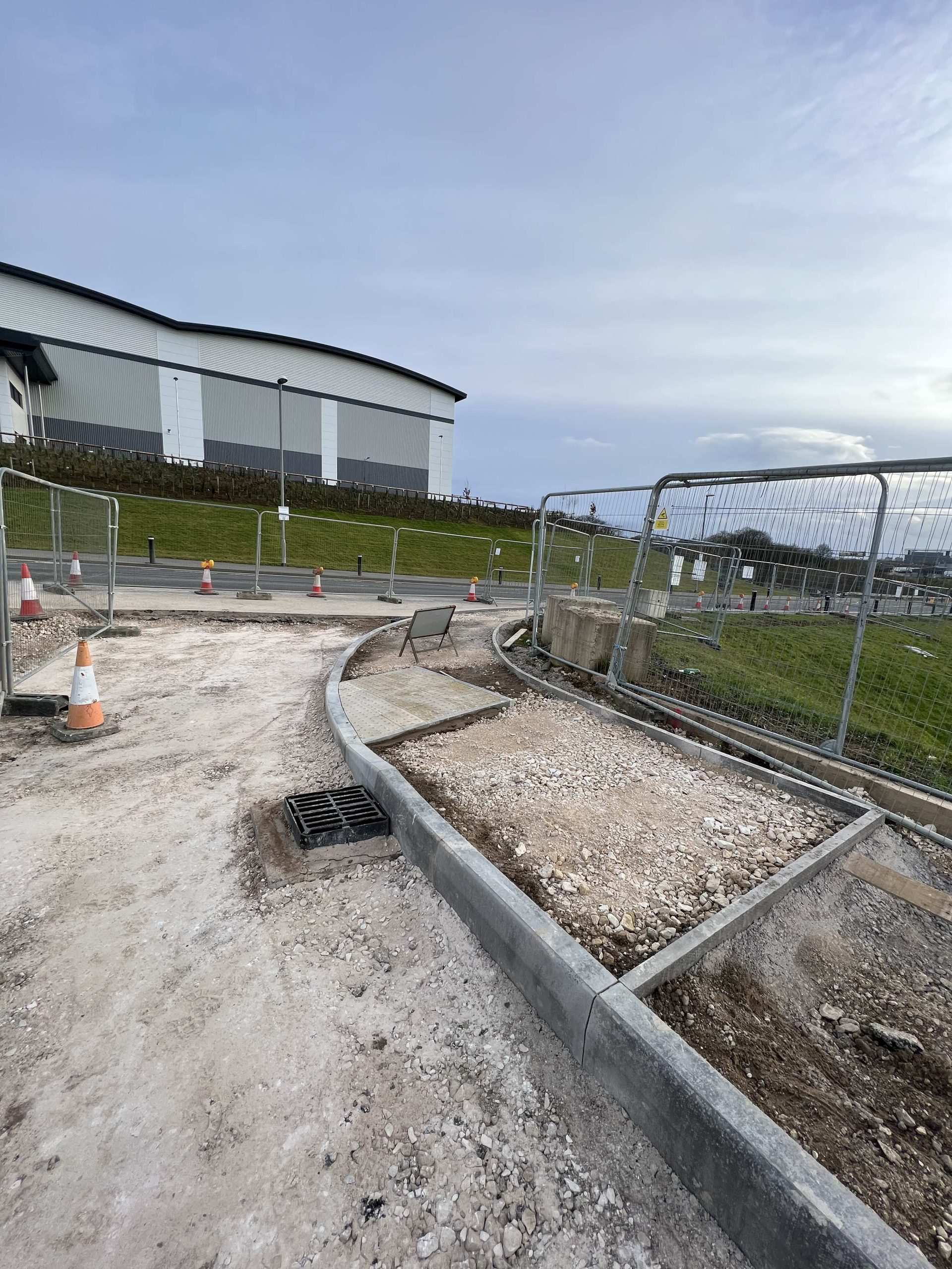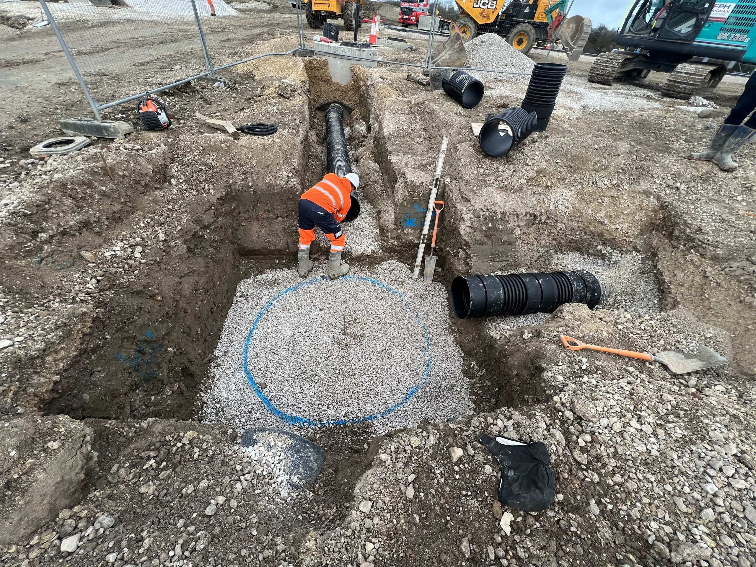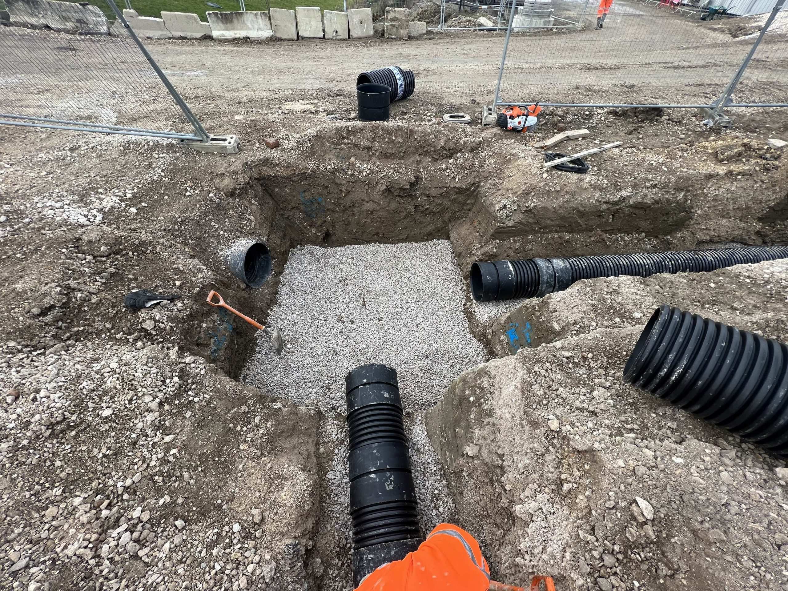 In February of 2023 we were invited to return and make the foul and surface water connections onto the Severn Trent water sewers in the existing highway. Works included installation of a new site entrance, with the priority of maintaining 24 hour access into the busy site at all times. On completion of these works we were further instructed to carry out the installation of flow control chambers, ACO kerbs and 3000m² stoning up ready for tarmac.