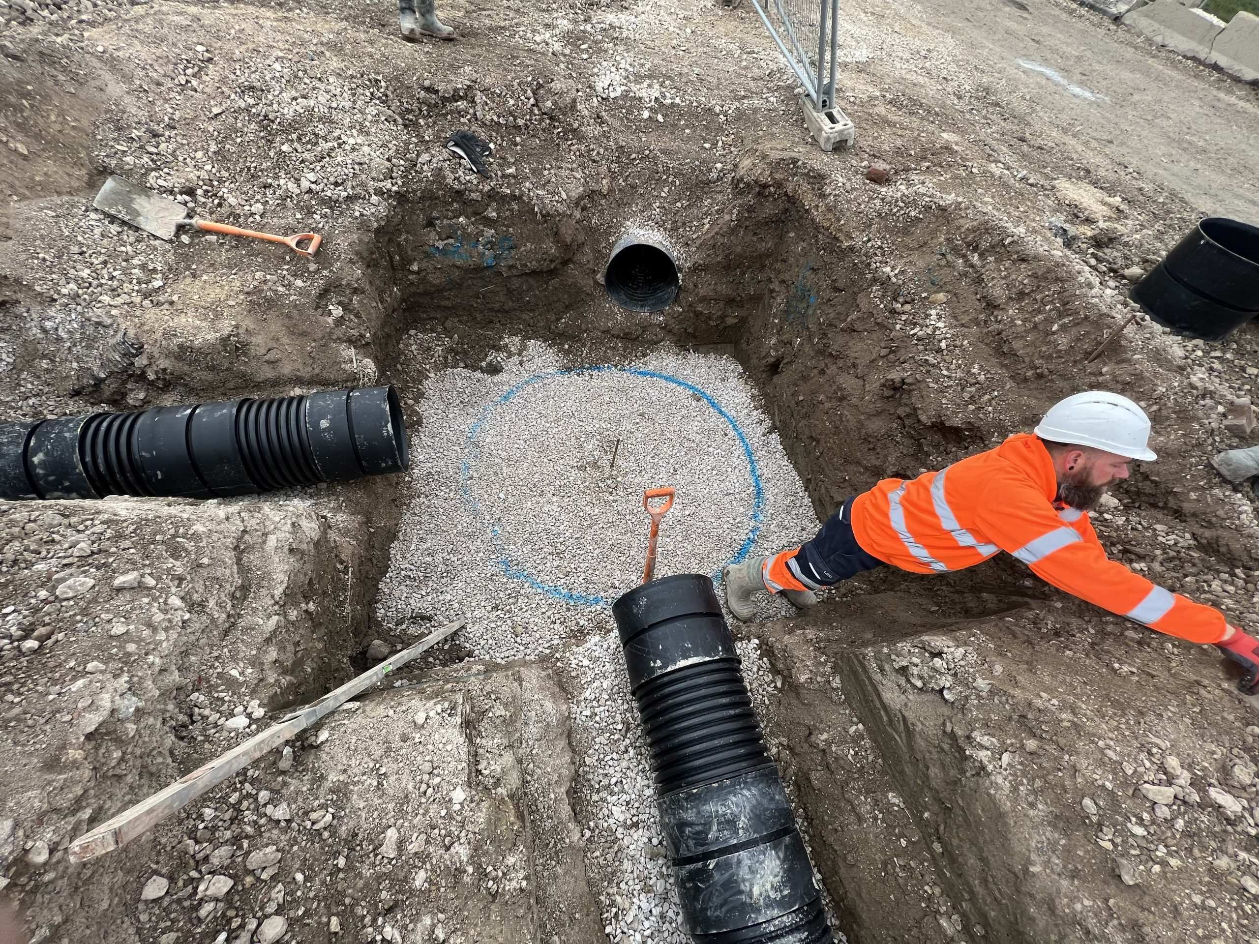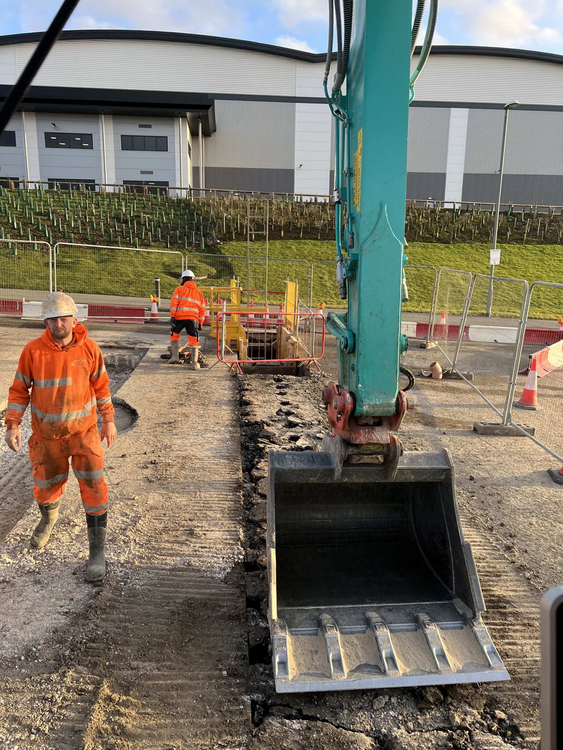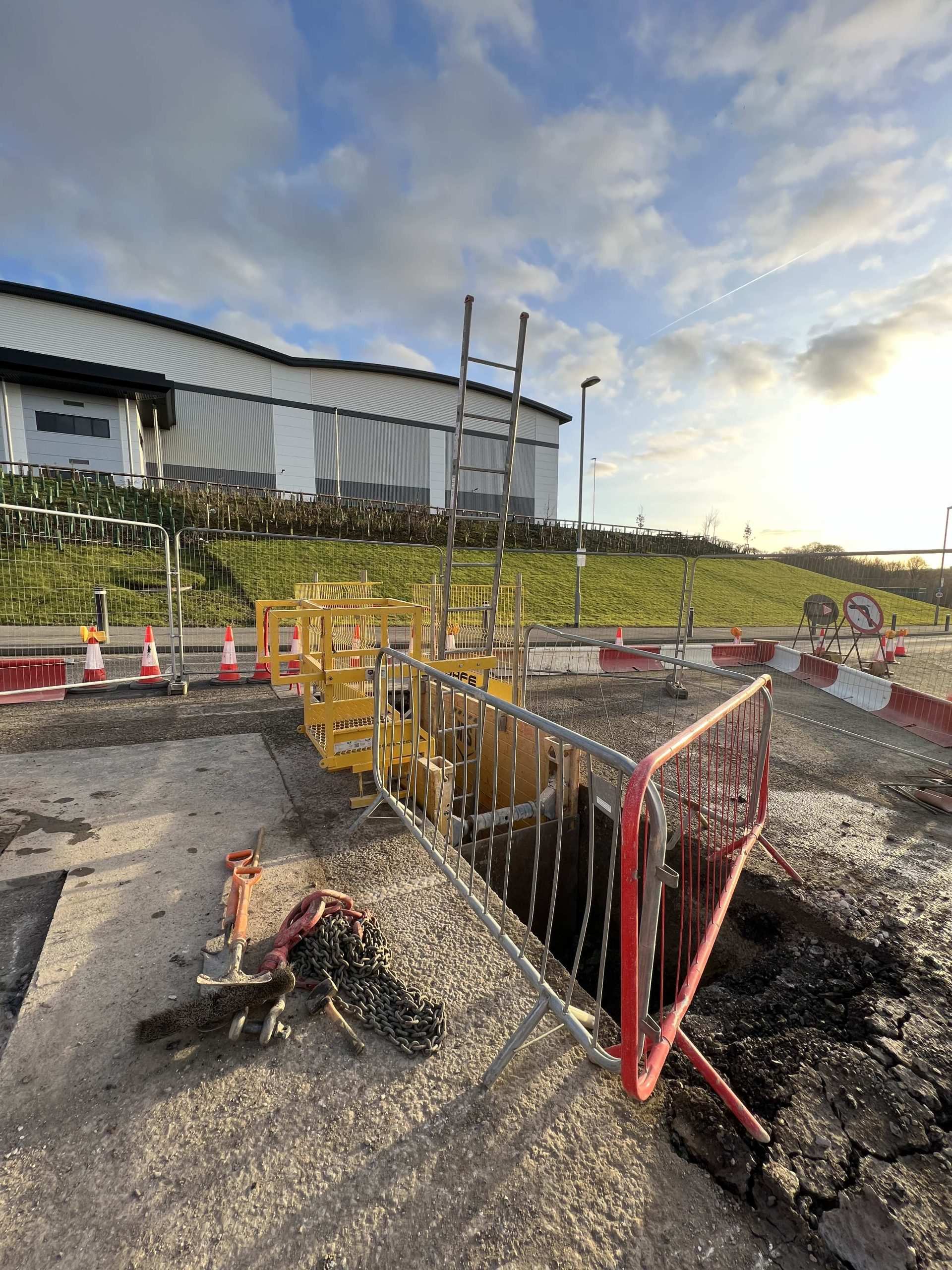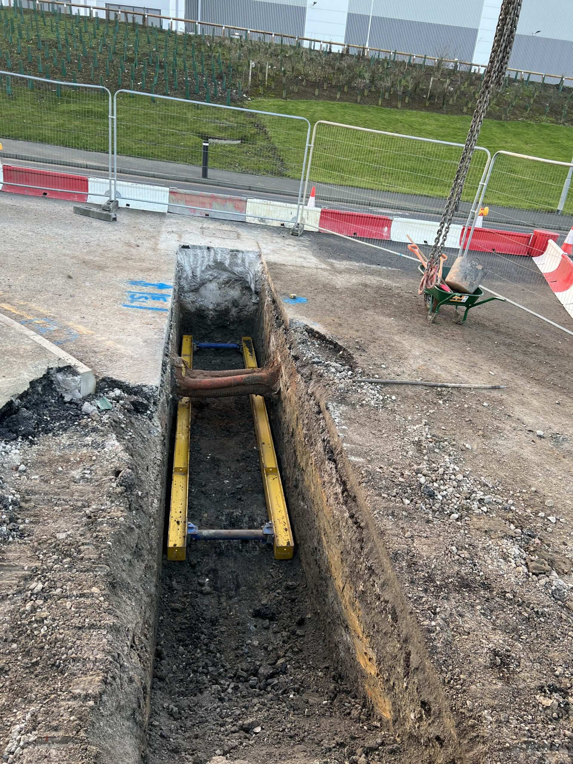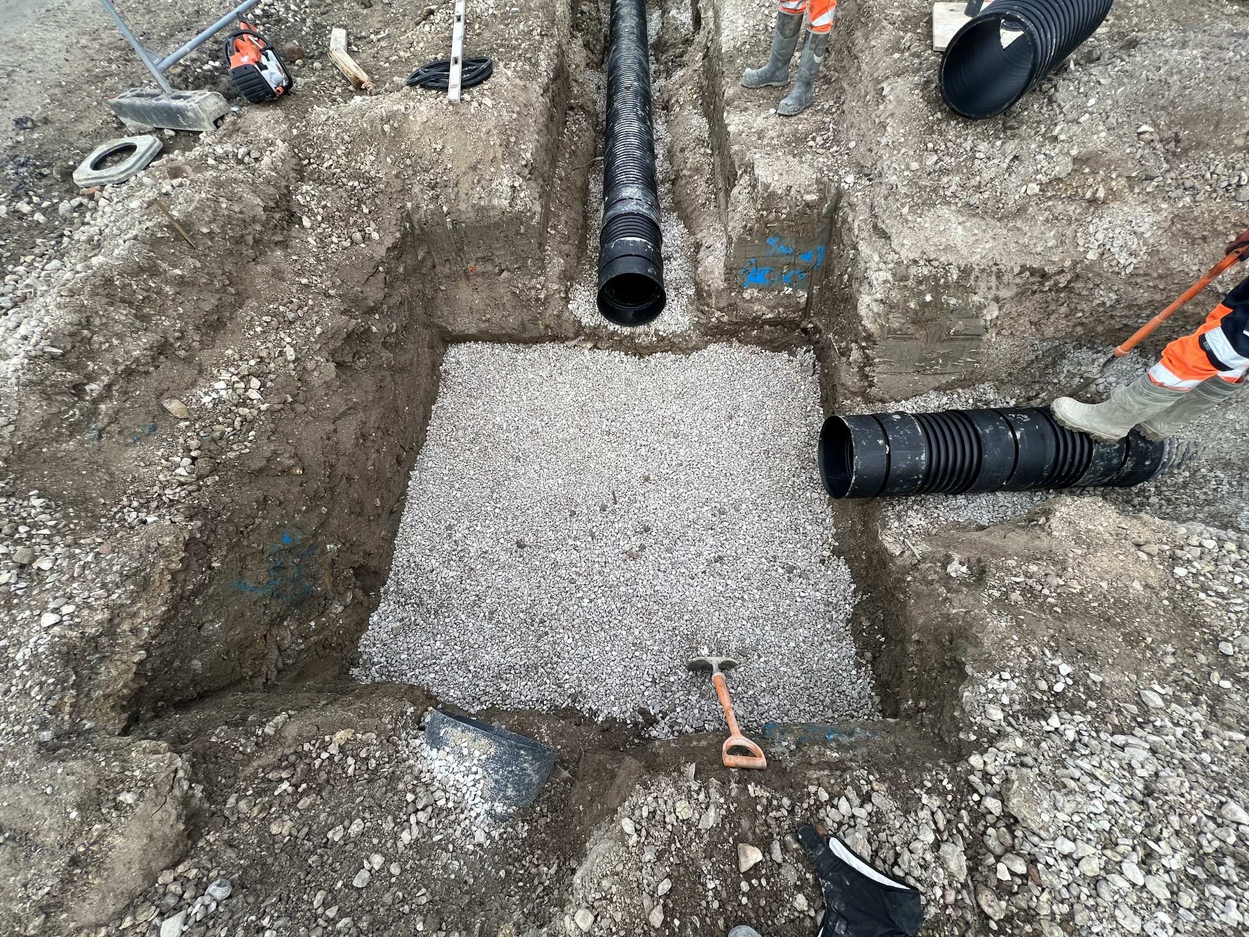 In February of 2023 we were invited to return and make the foul and surface water connections onto the Severn Trent water sewers in the existing highway. Works included installation of a new site entrance, with the priority of maintaining 24 hour access into the busy site at all times. On completion of these works we were further instructed to carry out the installation of flow control chambers, ACO kerbs and 3000m² stoning up ready for tarmac.