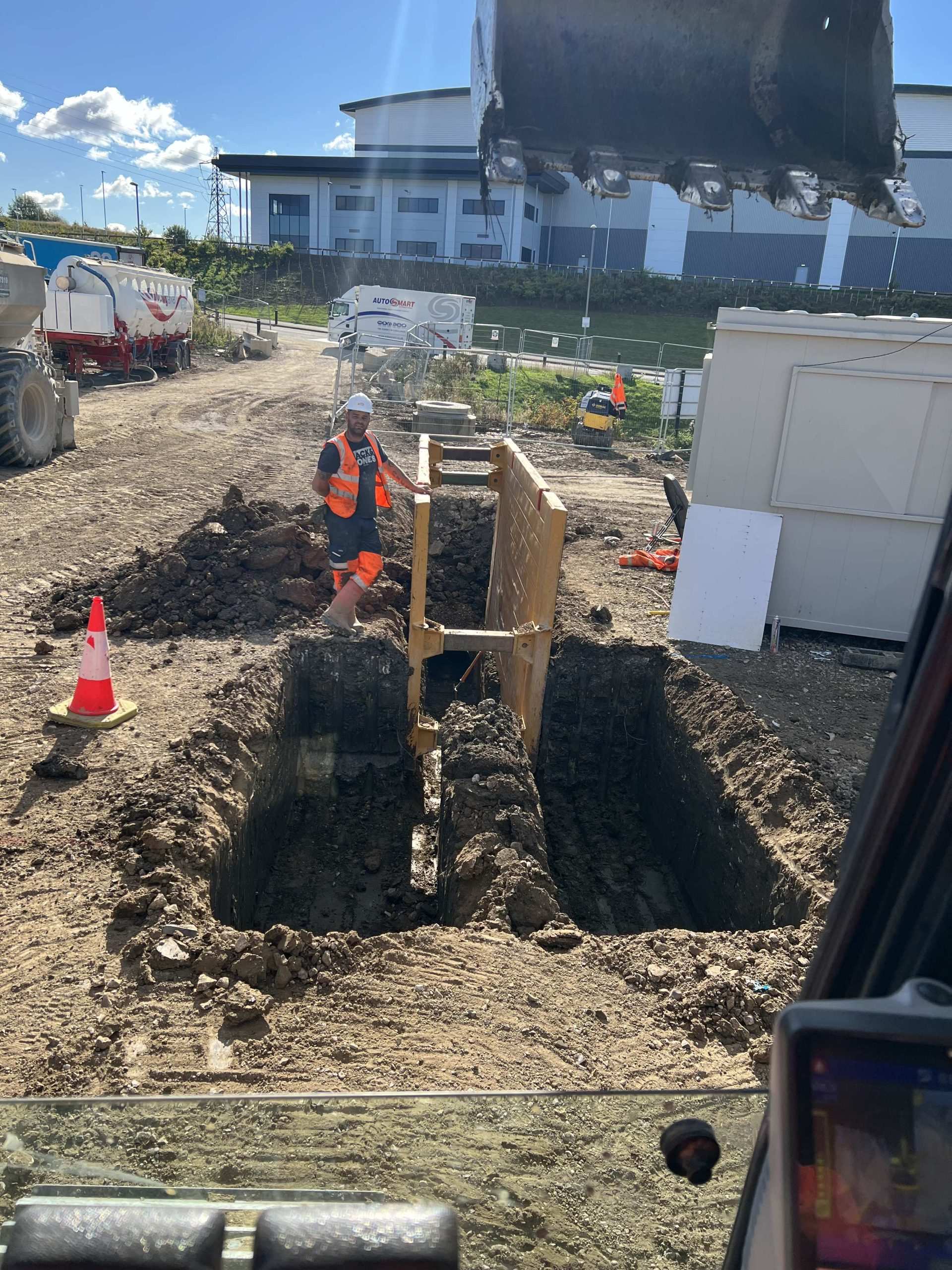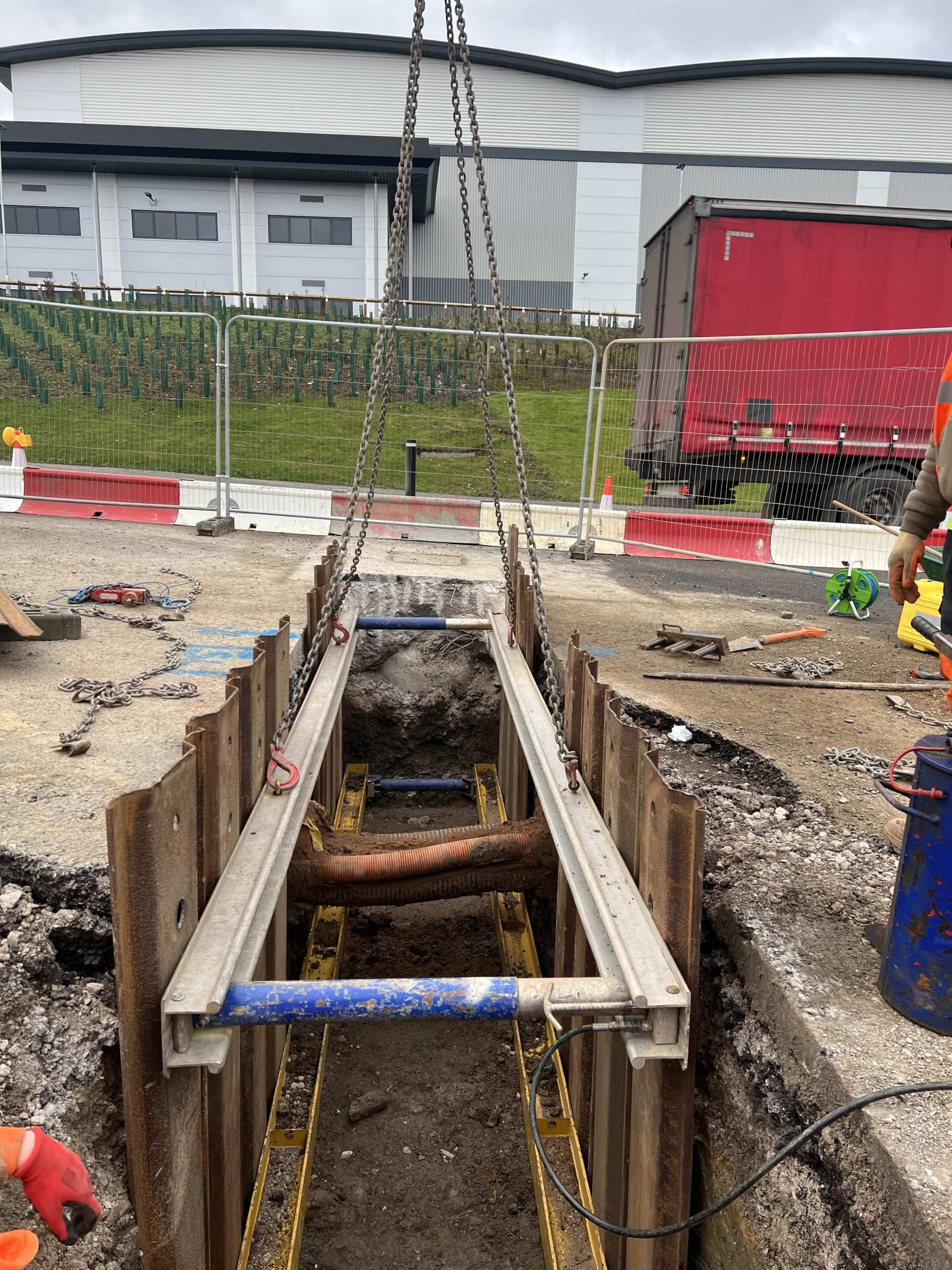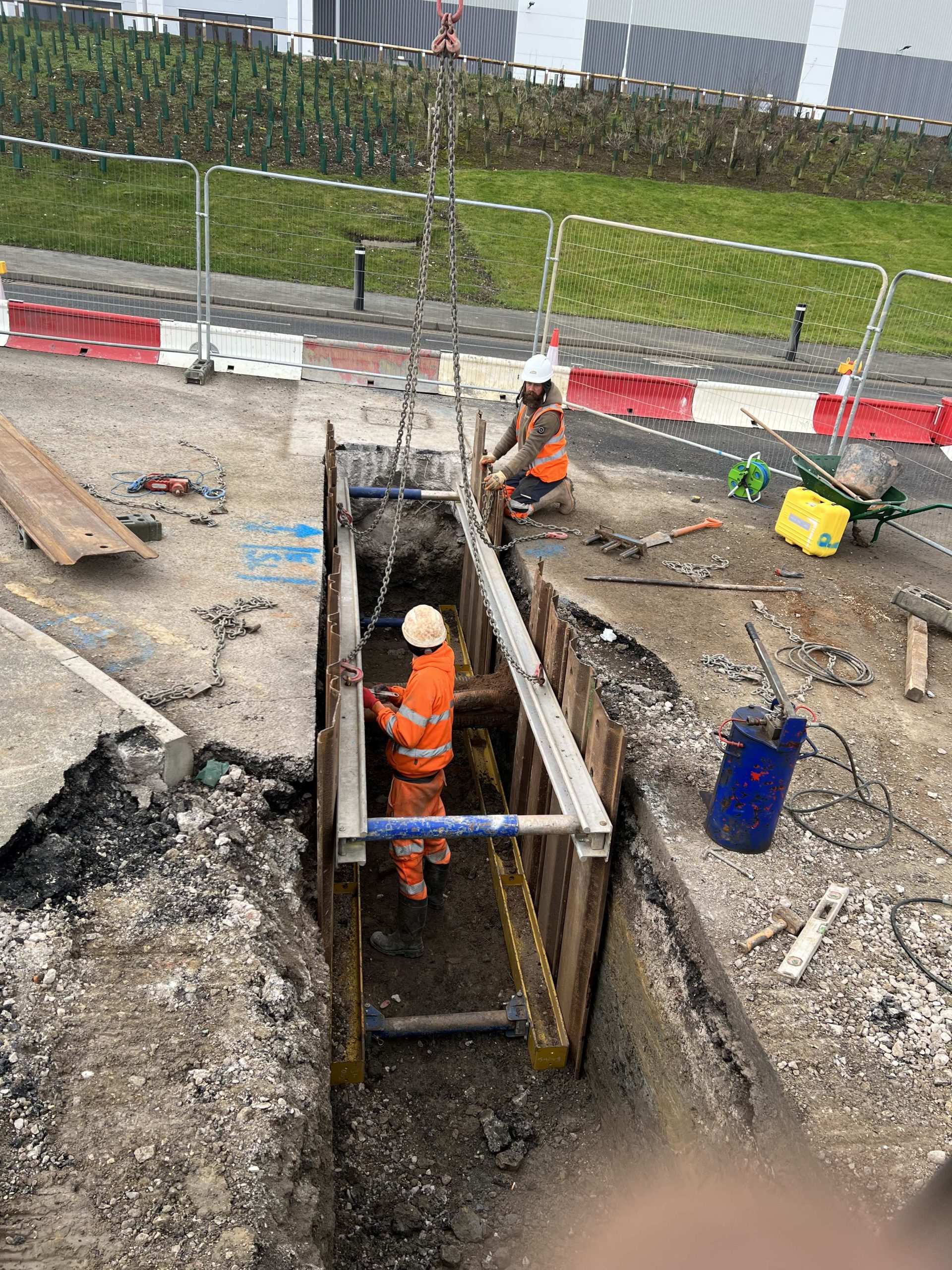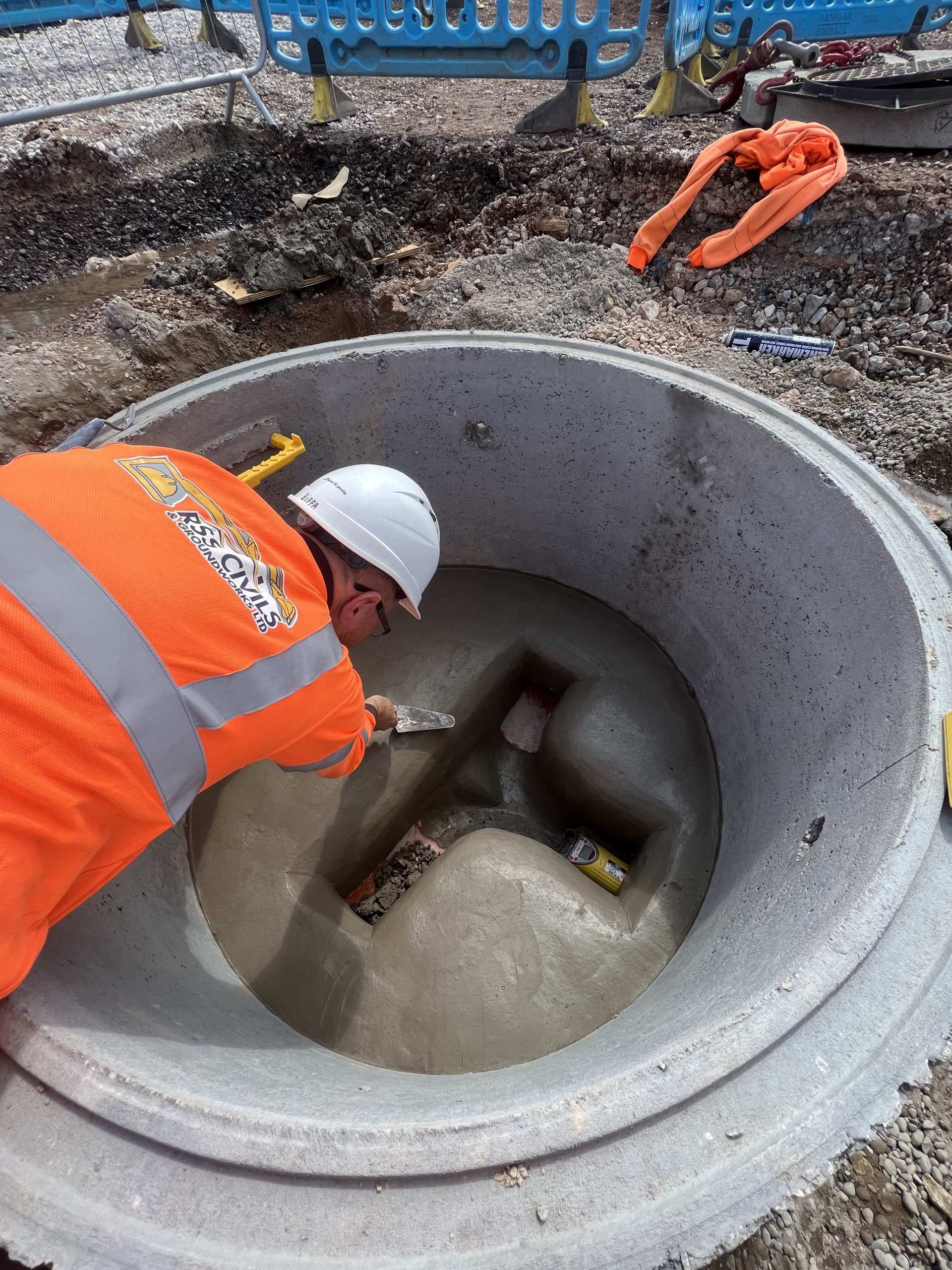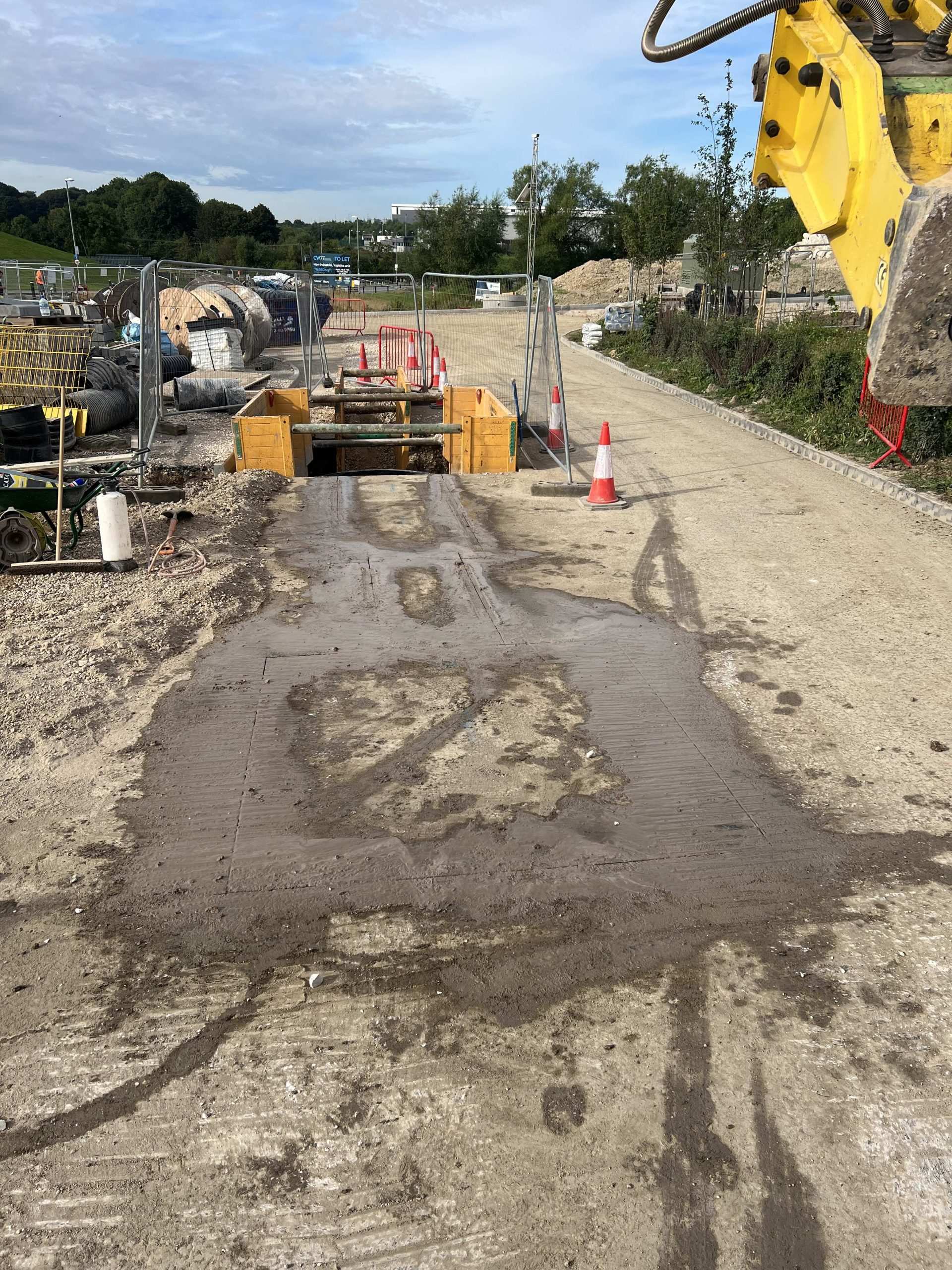 In February of 2023 we were invited to return and make the foul and surface water connections onto the Severn Trent water sewers in the existing highway. Works included installation of a new site entrance, with the priority of maintaining 24 hour access into the busy site at all times. On completion of these works we were further instructed to carry out the installation of flow control chambers, ACO kerbs and 3000m² stoning up ready for tarmac.